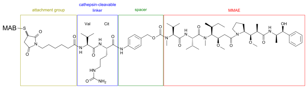 下図の赤い部分がMMAEで、青い部分がカプシンにより切断されるリンカーです。